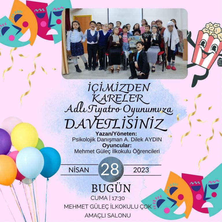 Okulumuz Rehber Öğretmeni A. Dilek AYDIN tarfından yazılıp yönetilen "İçimizden Kareler" adlı tiyatro oyunu, Okulumuz öğrencileri tarafından sergilenmiştir. Katılımlarıyla öğrencilerimizi onurlandıran tüm misafirlerimize teşekkür ederiz.